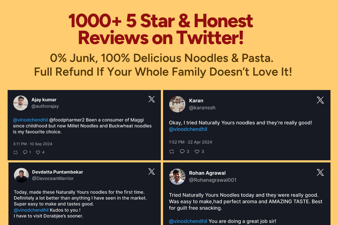 We have achieved this feat without adding any chemicals whatsoever to our products. All our noodles & pasta are maida free, preservatives free, & additives free.